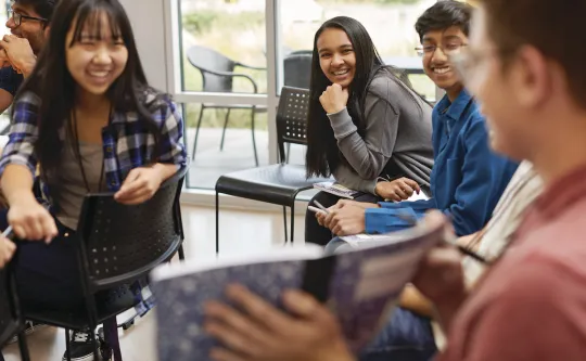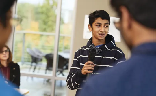 Group of teens supporting a group member after a presentation Group of teens supporting a group member after a presentation